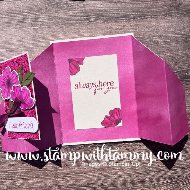 My card features the beautiful Lovely Arrangements Bundle paired with the Floral Charm Designer Series Paper. Berry Burst is such a vibrant color! For the piece behind the flowers, I embossed with the Stone & Vine 3D Embossing Folder, then “dragged” my ink pad aover it to create some dimension! The rest is pretty straightforward–leave me a comment if you have any questions–would be happy to answer them!