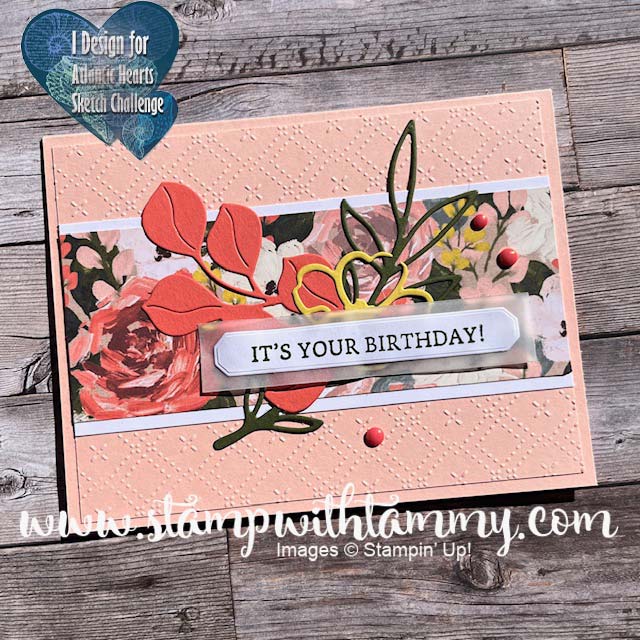 The card base is Petal Pink, and the die cuts are Calypso Coral, Darling Duckling and Mossy Meadow. The sentiment is layered onto a piece of vellum (yes, vellum is back!!!), and then popped up with Stampin’ Dimensionals. All the products are from the suite! The designer series paper is GORGEOUS!!! Be sure you check it out!
