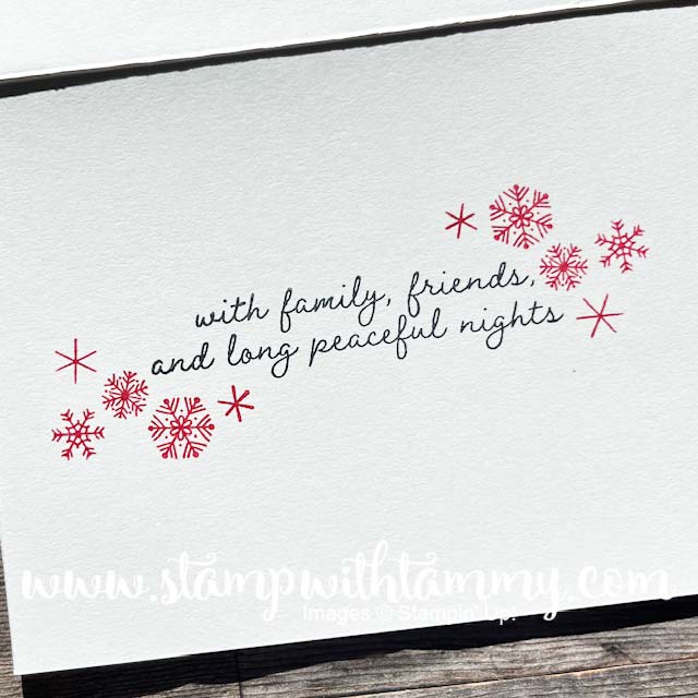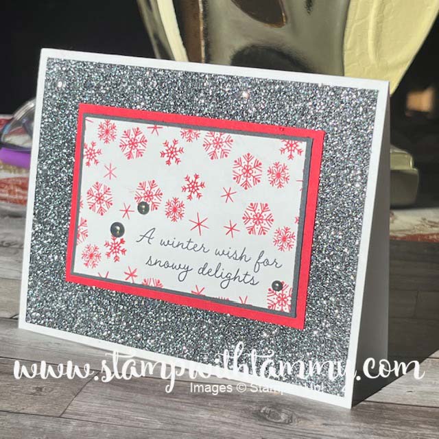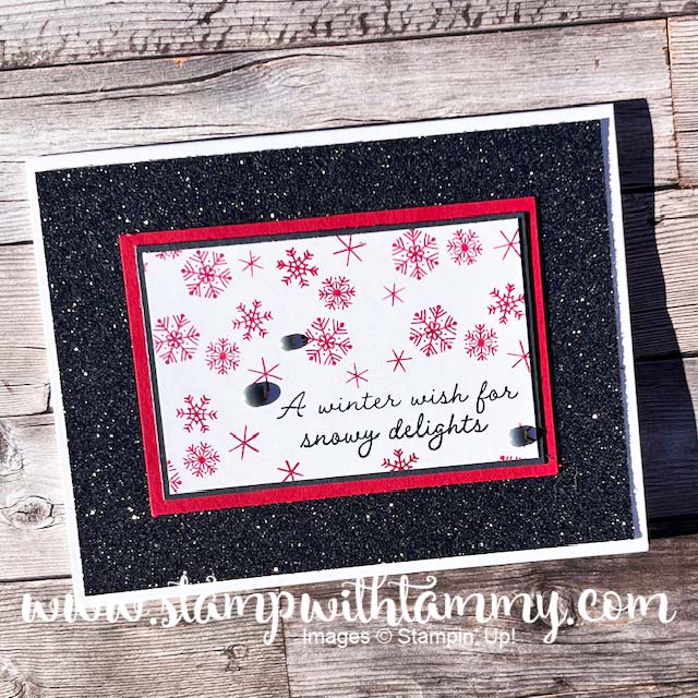 Today’s card and video feature the Snowy Delights Stamp Set! The colors are Real Red and Secret Sea–what a great combination! I really had my heart set on using the Peaceful Garden Glimmer Paper, and this is what I came up with: